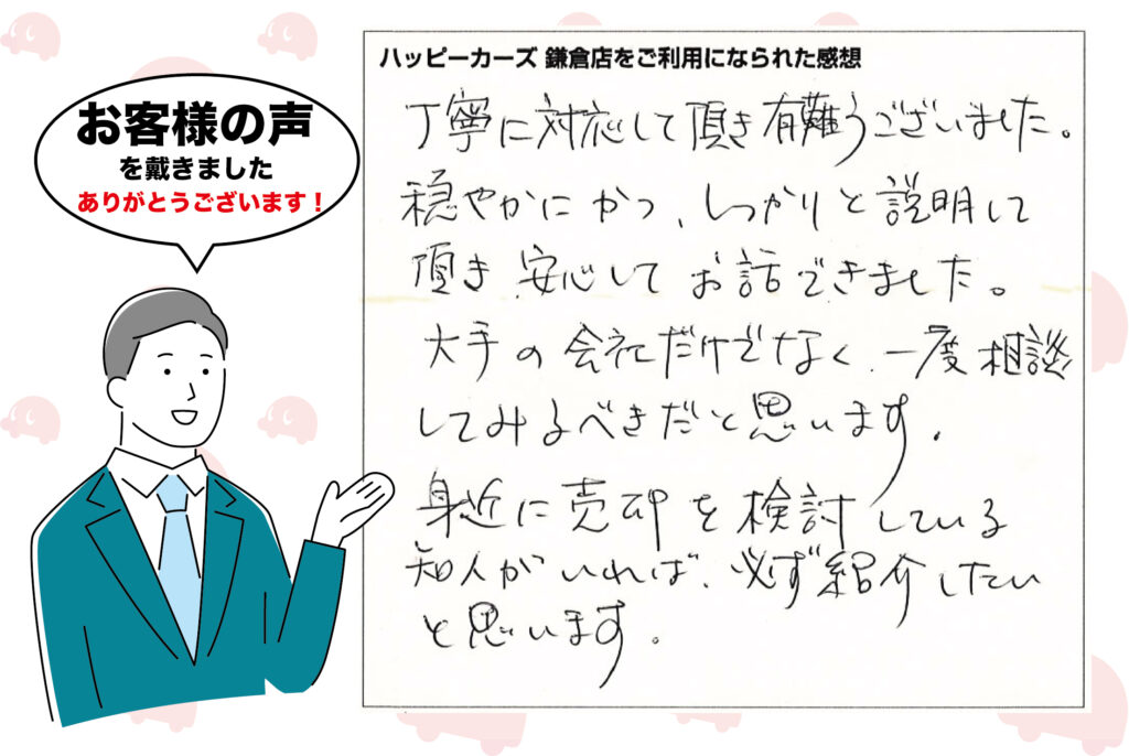 - 鎌倉市・パジェロをご売却丁寧に対応して頂き有難うございました。 穏やかにかつ、しっかりと説明して頂き、安心してお話できました…